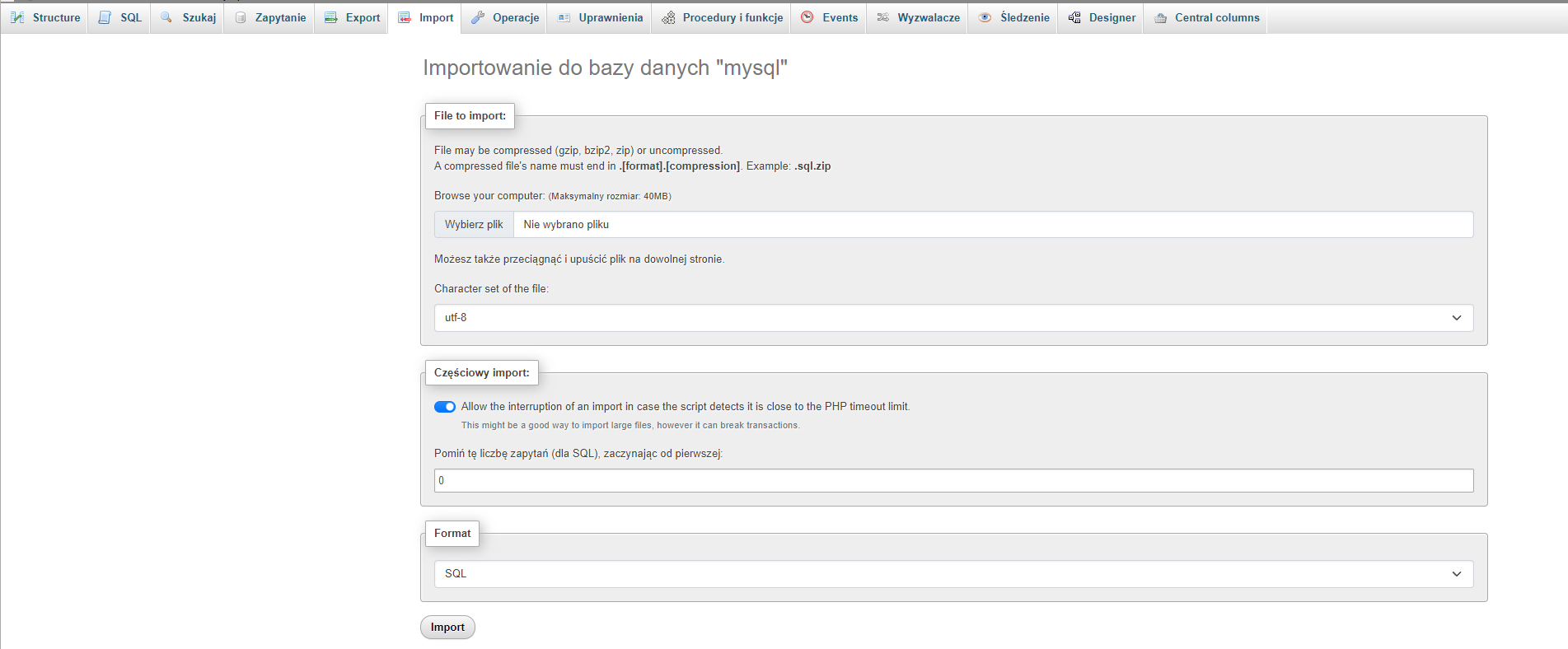 Import bazy danych – Gdy już mamy utworzone dostępy to pora zaimportować bazę danych. Logujemy się do phpmyadmin na nowym serwerze, wybieramy naszą bazę i klikamy Import. Wybieramy nasz plik z bazą danych i na samym dole mamy przycisk import, który klikamy.
